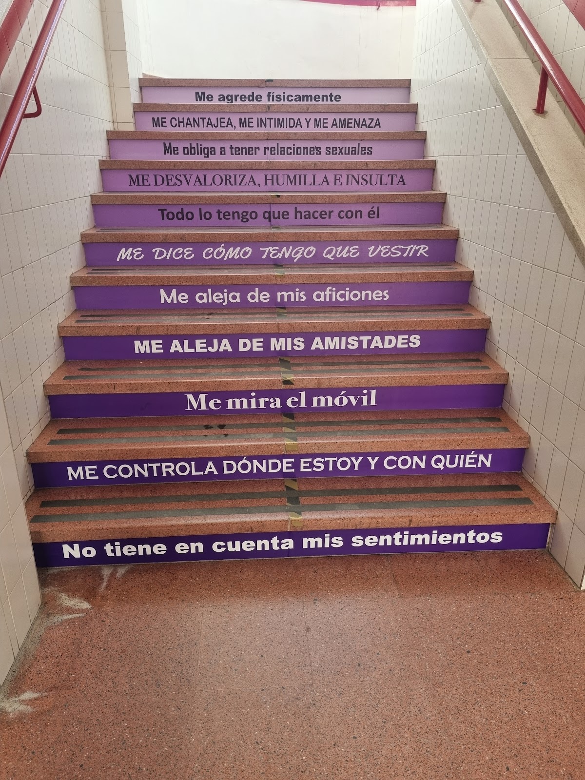 Dentro de nuestra comunidad educativa en el IES Salmedina, creemos firmemente que la igualdad, el respeto y la convivencia son pilares fundamentales. Por eso, cada año invitamos al alumnado a participar activamente, a expresar sus ideas y a convertirse en agentes de cambio. La voz de las y los estudiantes es esencial, porque son ustedes quienes construirán las relaciones y la sociedad del mañana. Para ello, hemos elaborado unas frases en la ESCALERA CONTRA LA VIOLENCIA, para que siempre esté presente en nuestro centro, UN TENDEDERO DE DENUNCIA CONTRA LA VIOLENCIA y se han elaborado unos manifiestos en contra de la violencia de género por el alumnado de 3º y 4º ESO. Además, con el alumnado de 1º y 2º ESO se han elaborado unas infografías y se ha realizado un mural contra violencia.