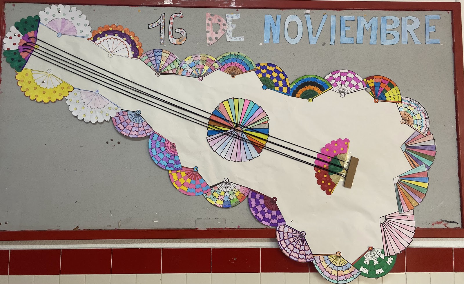 Cada curso de 1º y 2º de ESO realizaron 4 discos y con todos los discos se simuló una gran guitarra, la cual sirvió de decoración en una de las paredes del Hall de entrada del centro. El alumnado de 4º de ESO trabajó en profundidad en los palos del flamenco y realizaron dos carteles, un cartel sobre el Día del Flamenco y el otro cartel consistió en dibujar el árbol genealógico de los palos del flamenco. Así, como también se encargaron de la decoración y del montaje de……. Para finalizar, un alumno se encargó de dinamizar los recreos con vídeos musicales de conciertos de flamenco proyectados en la televisión que esta situada en la entrada del centro.