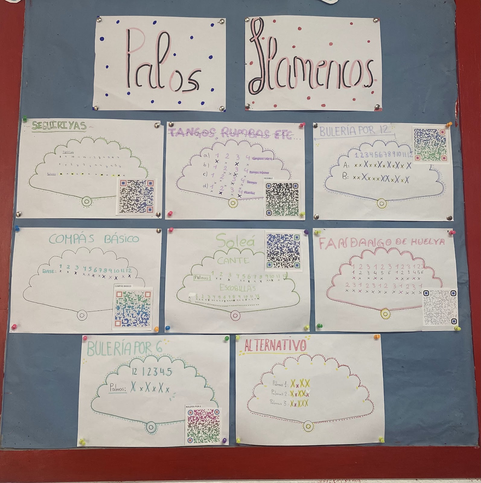 El alumnado de 1 y 2 de ESO, en las clases de música han trabajado varios aspectos musicales sobre el flamenco, tales como: vida y obra de cantaores/as, bailaoras/es y guitarristas. instrumentos más representativos del flamenco, han interpretado algunos de los palos más cercanos y de fácil manejo por parte del alumnado. Estos conocimientos se han visto plasmados en cartulinas de color rojo simulando discos de vinilo. En cada disco iba escrito una breve reseña sobre la vida y obra de un artista, fotografías de ese autor o autora, un palo o toque del flamenco, y por último, información mucho más extensa con vídeos e imágenes de ese artista por medio de un código Qr que te lleva a un power point.