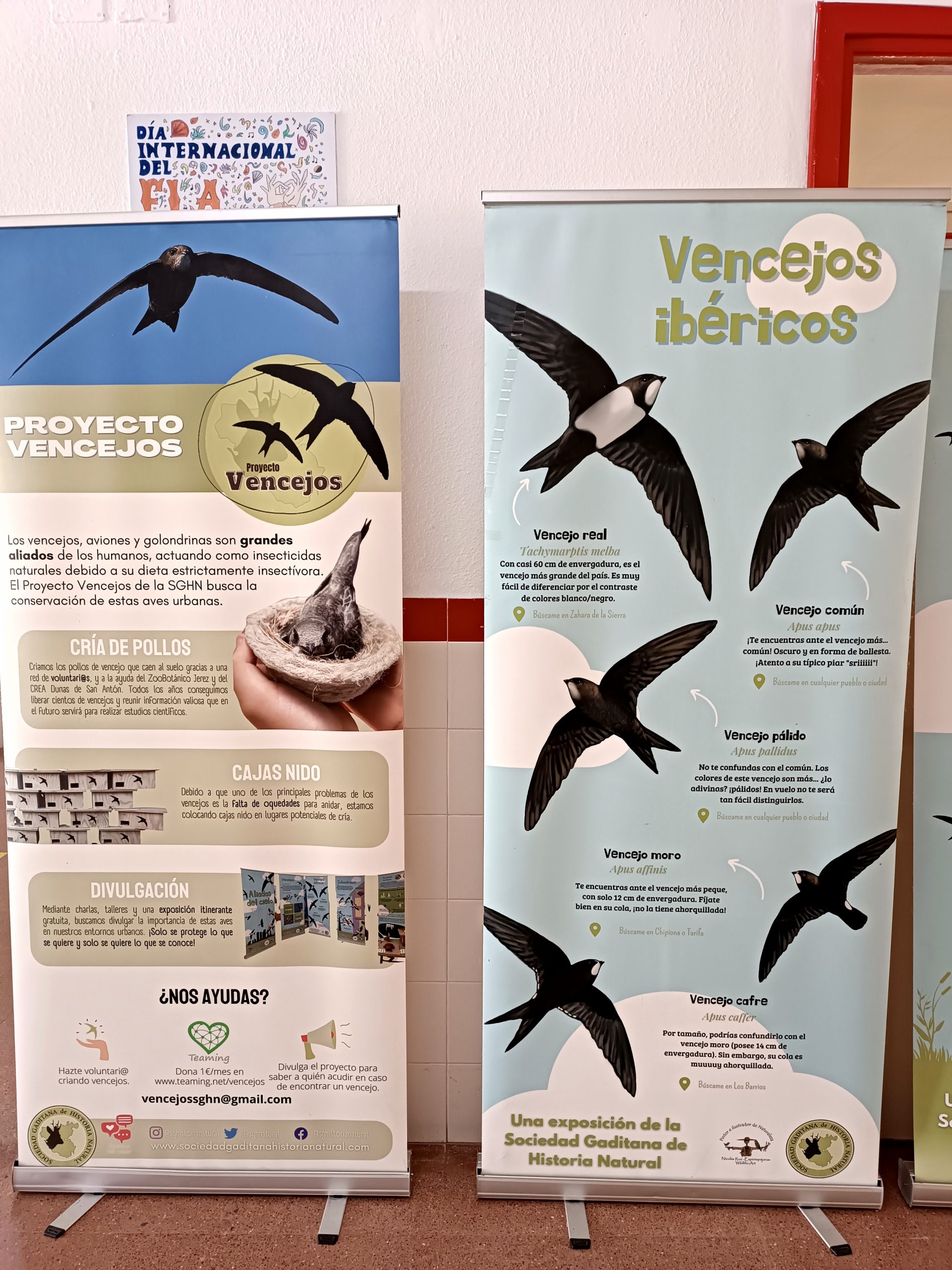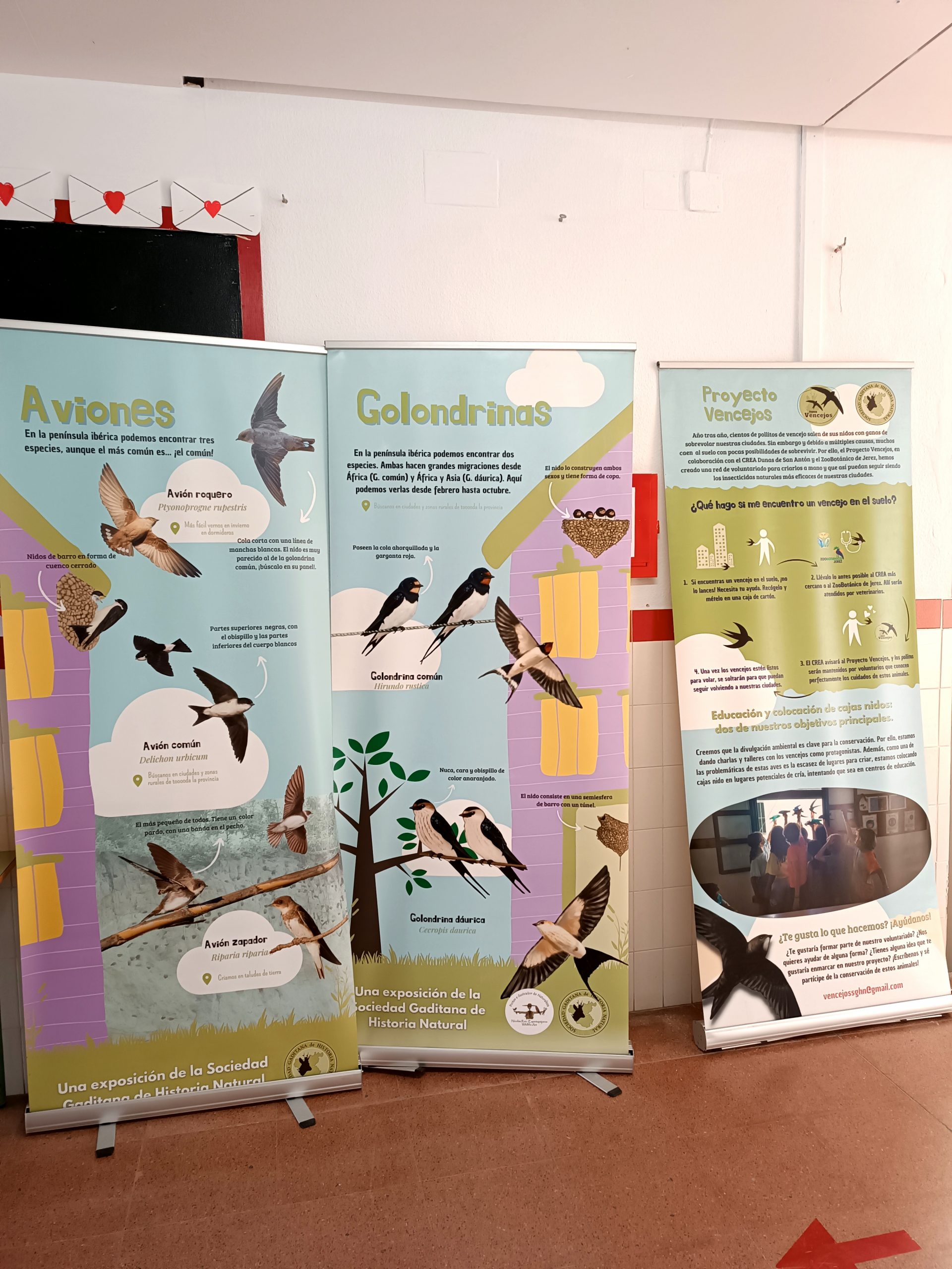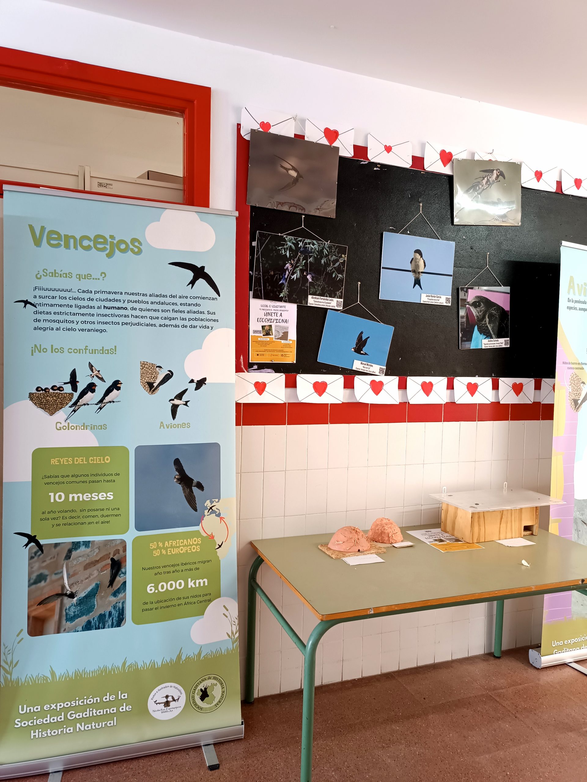 Durante toda la semana hemos contado con una exposición en el hall de entrada del centro. Está exposición, que nos la han cedido desde la Asociación Gaditana de Historia Natural, explica detalladamente las diferencias anatómicas de aves presentes en nuestro entorno, nos muestran como hacen sus nidos, y nos informan del protocolo a seguir al encontrarnos un polluelo en el suelo. Salvar la vida de los vencejos, unas aves protegidas, es muy importante en Andalucía, y en concreto en Chipiona, donde contamos con una población controlada en el muelle pesquero.